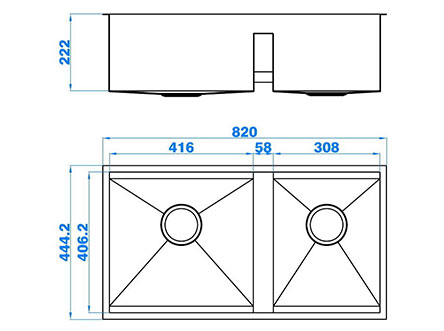 型號:5158款式:雙盆安裝方式:臺底式總尺寸:820*444.2 mm大盆:416*406.2*222 mm小盆:308*406.2*222 mm