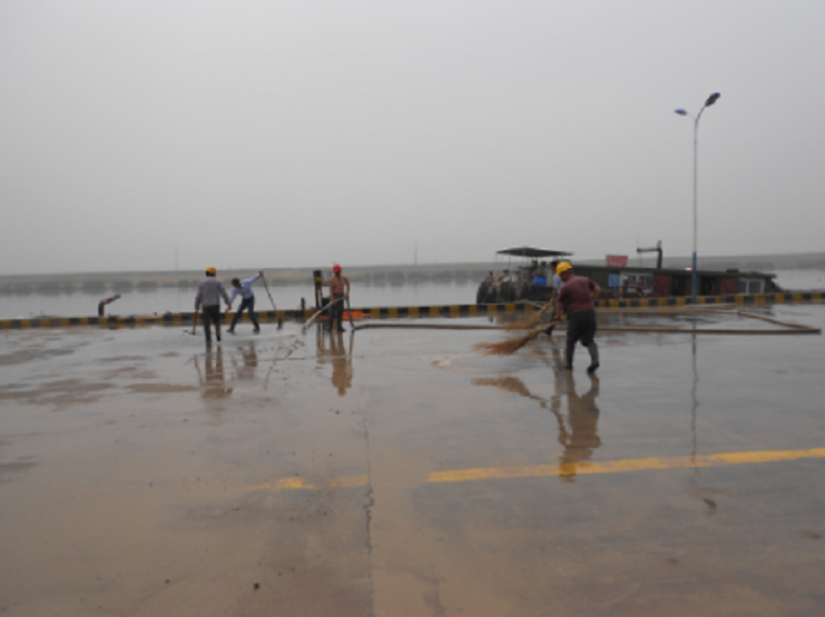 近期由于五灌河水位下降,給停靠碼頭的船只帶來了很大的安全隱患,于是公司決定對碼頭岸線的河道進行一次清淤工作,在清淤的運輸過程中使碼頭作業(yè)區(qū)一片狼跡,為了不影響宏港石化的PPA噸袋的吊裝業(yè)務(wù),6月11日上午公司班子成員主動放棄休息日與上班工人一道對碼頭作業(yè)區(qū)進行清理,他們有的用水槍沖,有的用掃帚掃,經(jīng)過二個多小時的奮戰(zhàn),作業(yè)區(qū)場地上渙然一新。(宵洋葛高平)