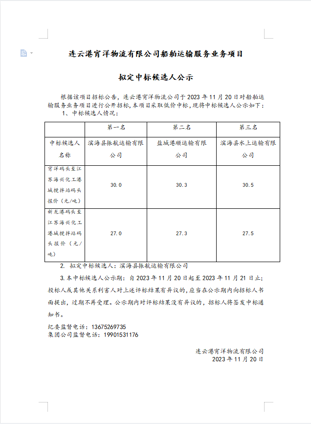 連云港宵洋物流有限公司船舶運輸服務業(yè)務項目擬定中標候選人公示