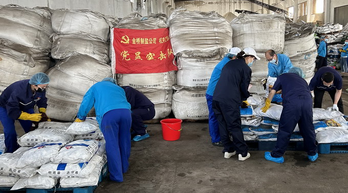 6月6日-6月7日,我公司黨委開展“我為黨旗增光添彩”志愿服務活動。機關支部共30名黨員協助車間整理庫房,共整理成品鹽130余噸?;顒拥拈_展進一步發揮了“兩個作用”,積極踐行了志愿服務精神,為車間一線辦實事、解難題。(金宣)