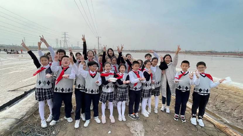 同學(xué)們近距離感受淮鹽的生產(chǎn)過程,聽老鹽工講述過去收鹽的故事。為了感受鹽工的辛苦,同學(xué)們還興致勃勃地穿上膠鞋,來到鹽池中,用耙子扒鹽,用鏟子將結(jié)晶的鹽堆成堆,用手觸摸鹽的質(zhì)地,觀察鹽的結(jié)晶形狀……同學(xué)們不禁感慨小小鹽粒的來之不易。