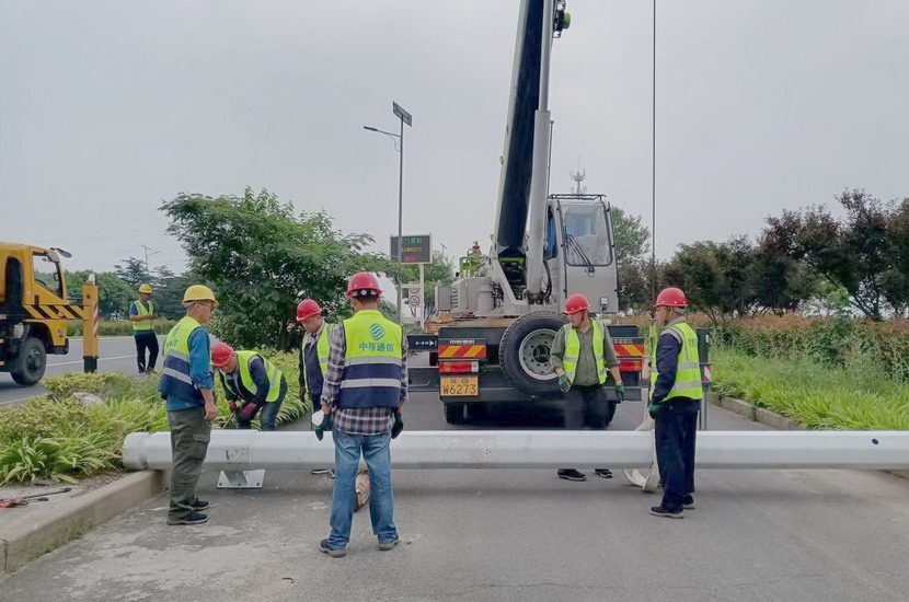 隨后,筆者一行,頂著烈日,驅車前往翔立分公司市政工程現(xiàn)場,在封閉的道路內,翔立公司一群黃馬甲戰(zhàn)士,正頂著烈日在緊張的進行交通監(jiān)控探頭安裝工作。據(jù)了解他們也是5點多種就到崗位上來了。經(jīng)理喬以成帶著兩名員工站在高高的升降機上,鉗子、扳手、鏍絲刀,各種工具在他們手里輪番操作,汗水已將其工作服的前胸后背浸透。好不容易等到他們安裝完一組探頭下來,我們一邊遞水,一邊采訪,老喬擰開瓶蓋,一口氣喝下半瓶,這才回答我們的問題:“不能不拼啊,我們離盈利還有不小的缺口,現(xiàn)在全公司、全集團都在解放思想提質增效,不干、不努力哪里來的增效啊!”