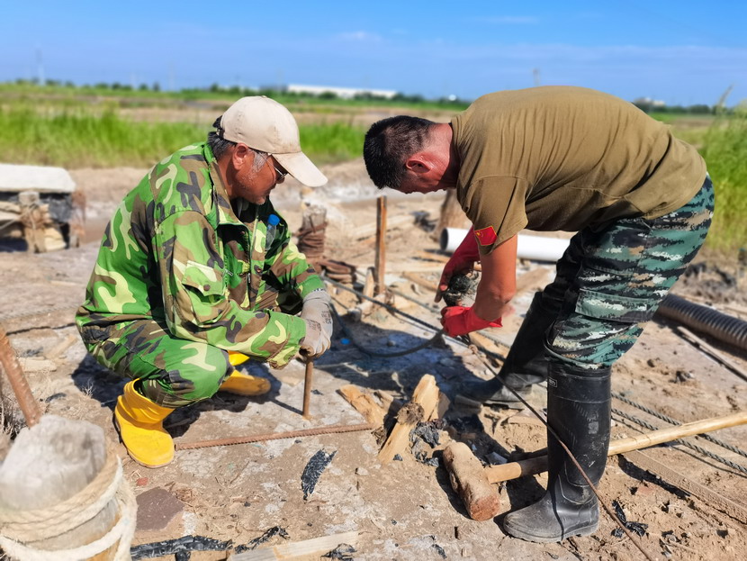 來到海州灣公司灘頭,遠遠望見幾名職工在鹽池里勞作,走近一看,組長夏軍正帶領一組人整修塑苫池。“我們5點就出來了,趁早涼,趕緊把塑料布整理一下,布子上都是鹵,長了鹽就不好處理了,搞不好這鹵水還會淌到外面去,造成浪費......”邊說著邊用肩膀頭子蹭一下眼角的汗水,手里的活一直沒停。據(jù)了解,海州灣公司承接臺北礦鹽和鈣液兩大產(chǎn)業(yè),經(jīng)濟比重占全公司收入60-70%,當前雖然是高溫期,但是廣大職工搶抓汛期難得的晴好天時,每天清晨5點就在灘地上忙碌起來,汗水模糊了雙眼,額頭的汗水順著帽檐往下滴落,身上的衣服一直都是濕漉漉的,緊貼在身上,即便如此,他們也毫不在意,用他們的話:“看著池子里每時每刻都在落鹽,這點汗就沒白淌啊!”我們臨走的時候,夏軍還不忘說:“今年我們保證鹽量突破2萬噸,不虧損。”