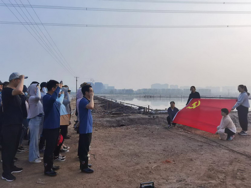伴著朝陽,全體黨員在灘頭進行了集體宣誓,重溫入黨誓詞。